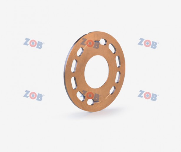 JF-800C双金属摩擦片是以低碳钢板为基板,表面烧结CuSn10Pb10铅青铜合金粉末,经过多次烧结轧制制成板材,再经过冲压落料、机械加工、双面研磨加工等工序制成高精度的双金属摩擦片。该产品是高压柱塞泵中的一个关键零件,与柱塞泵缸体形成一对摩擦副,缸体平面与配油盘相对摩擦,由于CuSn10Pb10铅青铜合金有良好的自润滑性能,所以能够显著降低高速运转时的摩擦热,避免烧盘咬合等问题产生,另外低碳钢板具有较高的机械强度,产品在承受压力时,变形小,配油盘能够始终与缸体平面均匀接触,运转时噪音小。产品具有节省铜合金材料、尺寸精度高、摩擦因数低、耐磨性能好、使用寿命长等优点。