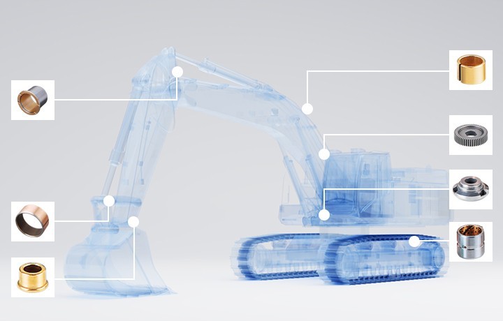 JF-MP摩擦焊接轴套运用于支重轮、托链轮、引导轮;双金属和SF系列衬套运用于泵车的臂架、连杆、支腿等部位;JDB系列固体镶嵌润滑系列轴套运用于动臂、斗杆、调幅机构、油缸等部位。